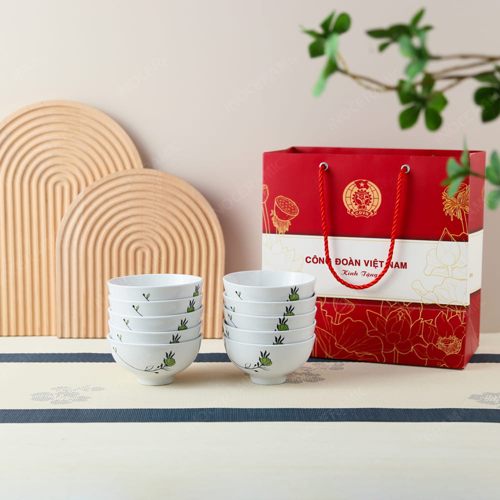 Quà tặng Công đoàn – Bộ 06 chén cơm men lam đào trắng in logo
